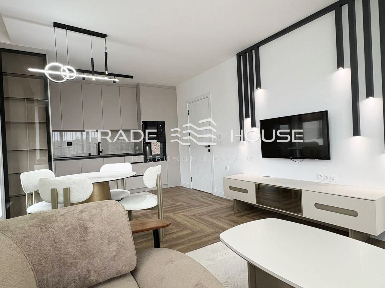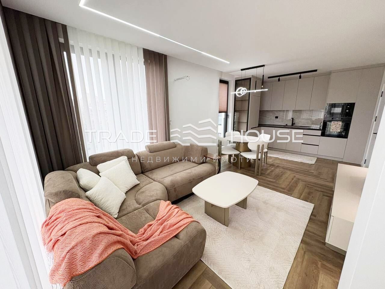 № 20037 Трейд Хаус недвижими имоти предлага двустаен апартамент обзаведен с луксозни мебели и висок клас вградени уреди.
