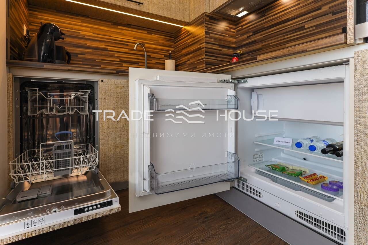 Кухня с всички уреди: хладилник, фурна, микровълнова, пералня, съдомиялна.