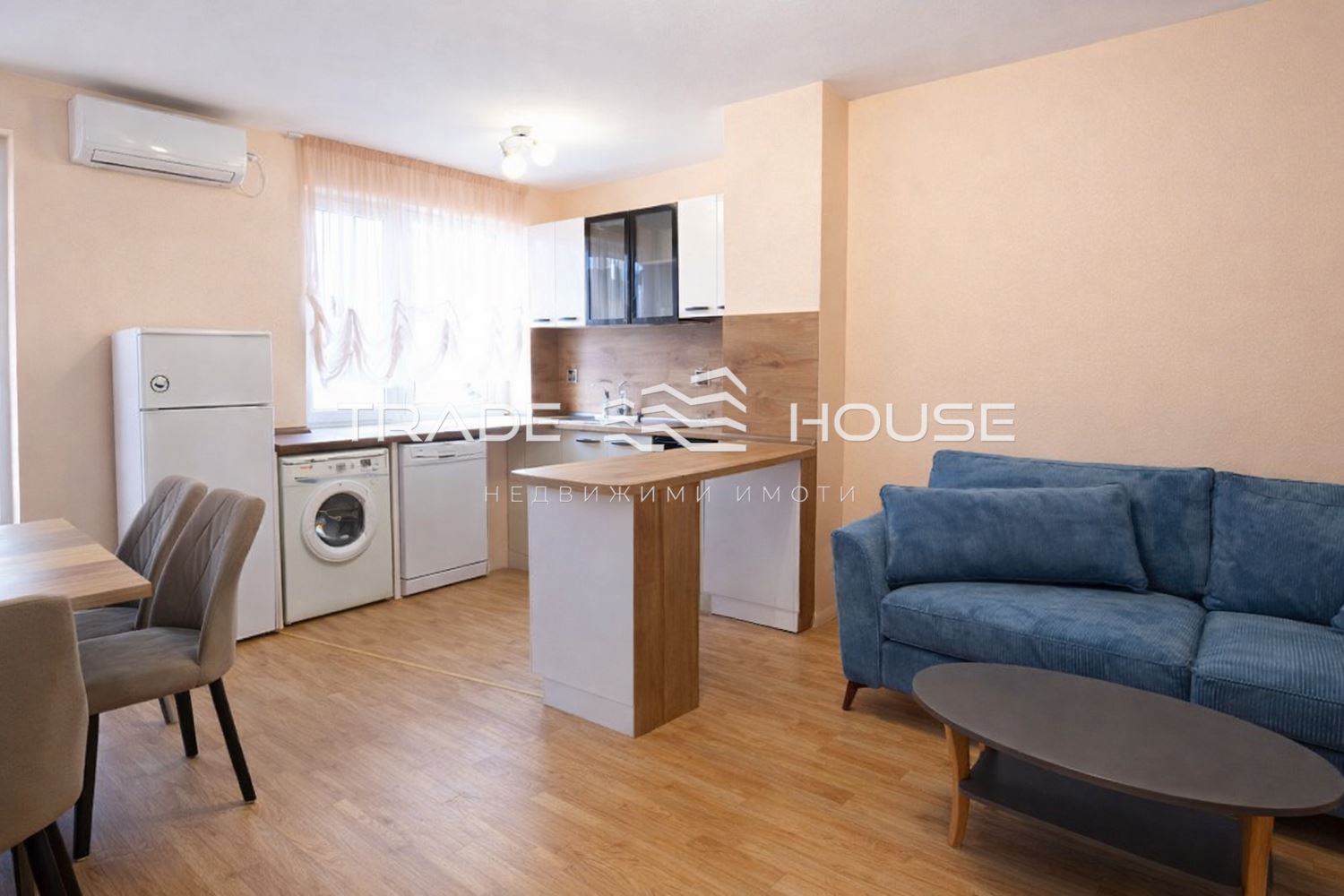 Напълно обзаведен с всички ел. уреди- хладилник, печка, съдомиялна и 3 климатика.