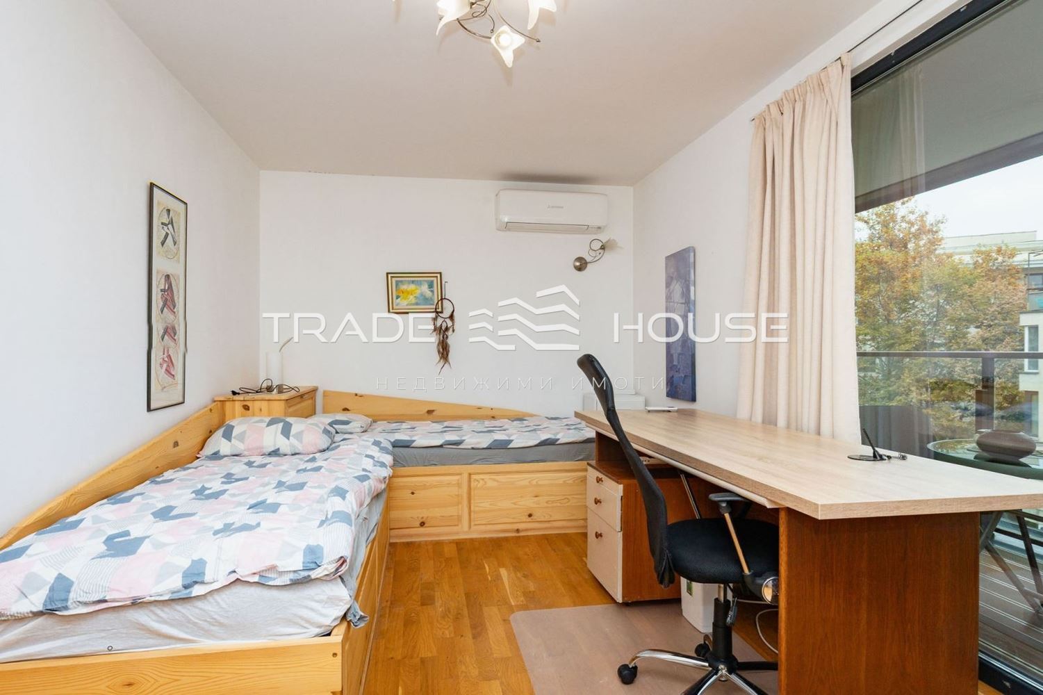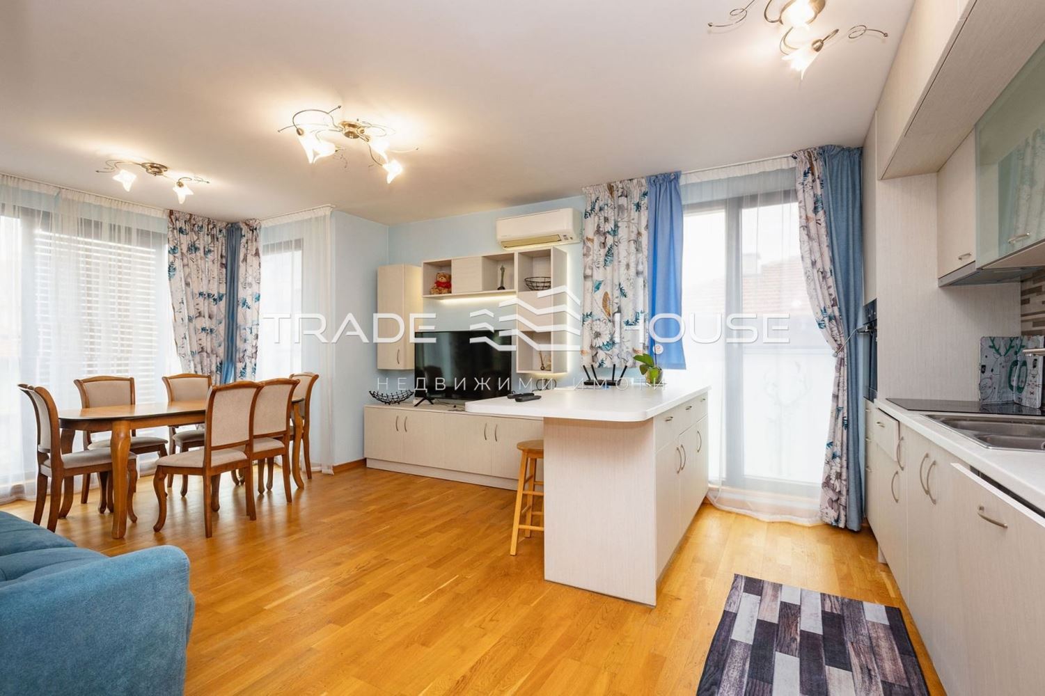№ 19316 Трейд Хаус недвижими имоти предлага модерен тристаен апартамент на централна локация в нова сграда срещу Дом на културата Борис Христов. 100 кв м, голям светъл хол с трапезария и кухня, спалня, стая с две отделни легла и работен кът, баня с тоалетна, отделна тоалетна, склад.