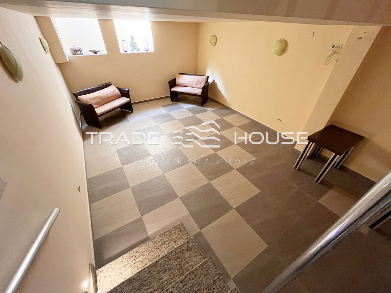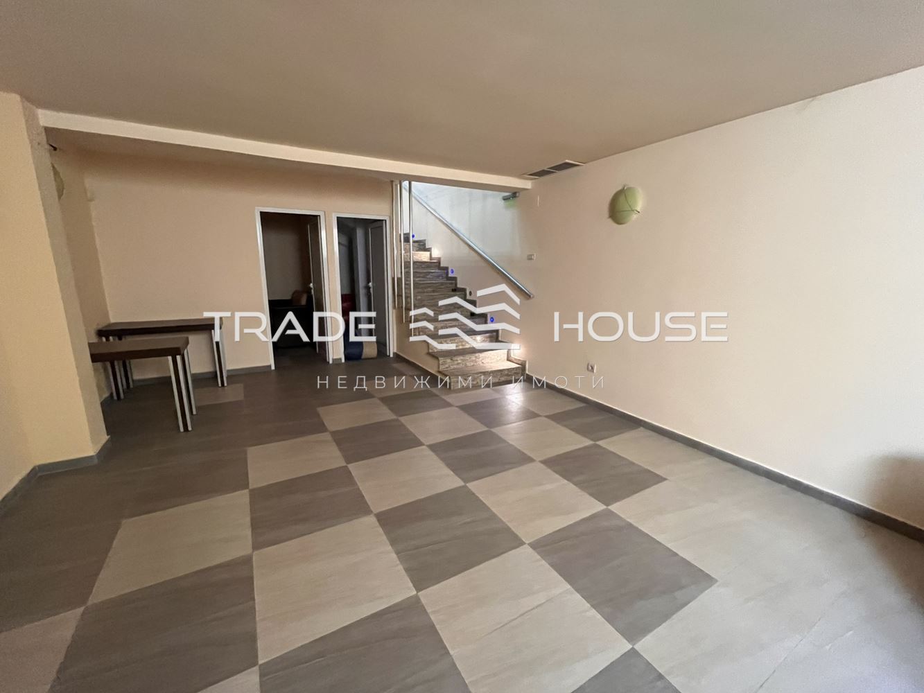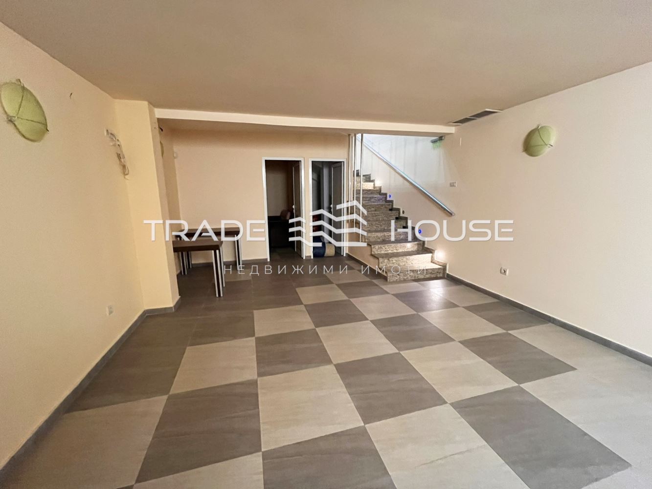 Разпределение: зала с тоалетна и предверие (партер), основно помещение, кабинет и склад с естествена светлина (сутерен). Свързани с вътрешно стълбище с гранит и LED осветление.